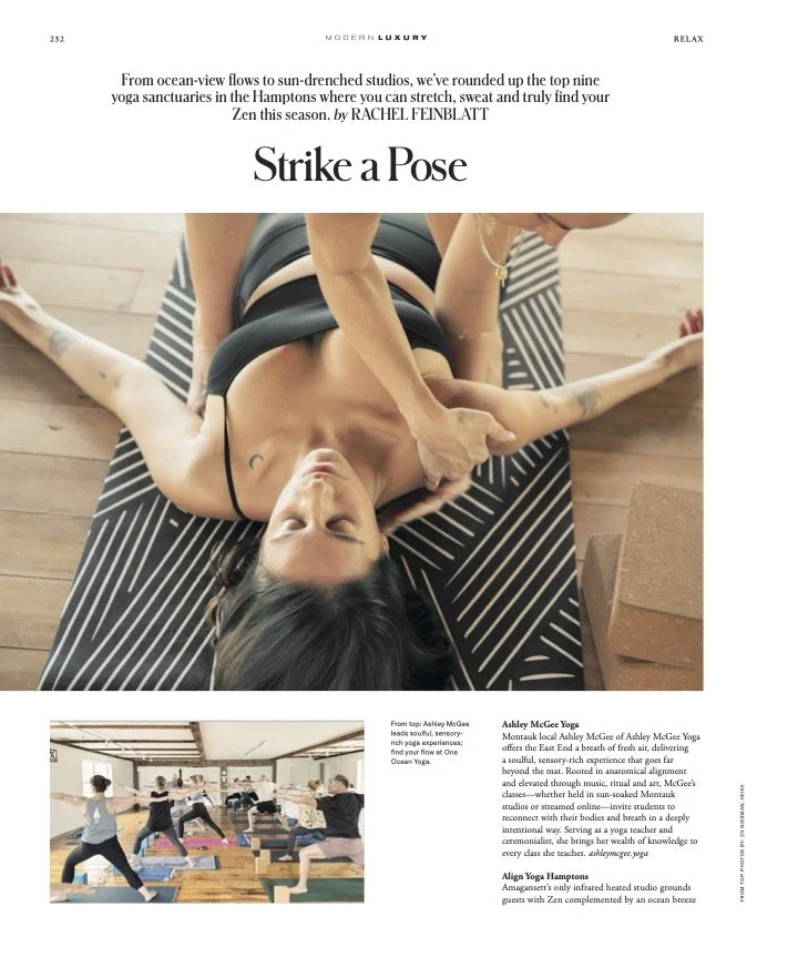 “Transform your Sunday spirituality with Ashley McGee’s unique Montauk yoga class…Ashley McGee brings a magical yoga experience to Montauk with her Sunday series.”