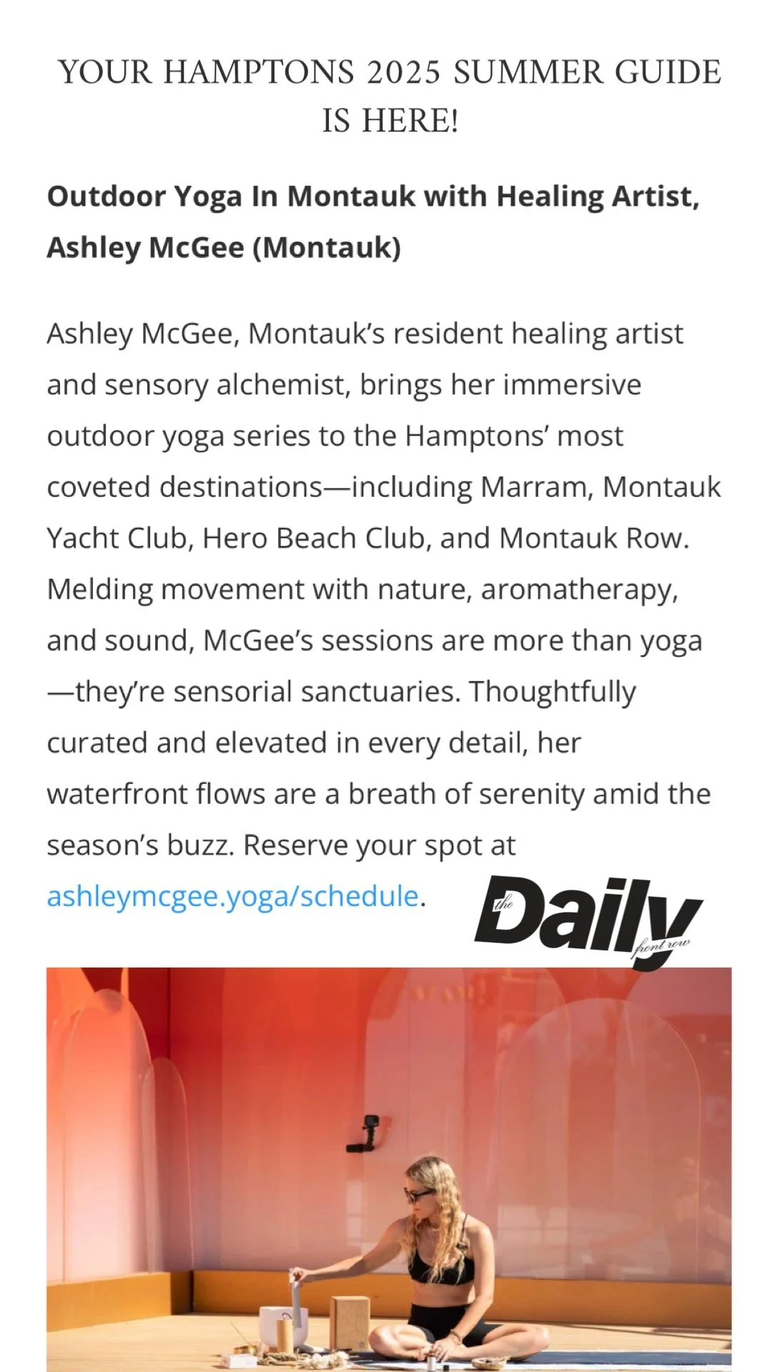 “Ashley McGee, Montauk’s resident healing artist and sensory alchemist, brings her immersive outdoor yoga series to the Hamptons’ most coveted destinations. Melding movement with nature, aromatherapy, and sound, McGee’s sessions are more than yoga—they’re sensorial sanctuaries. Thoughtfully curated and elevated in every detail, her waterfront flows are a breath of serenity amid the season’s buzz.”